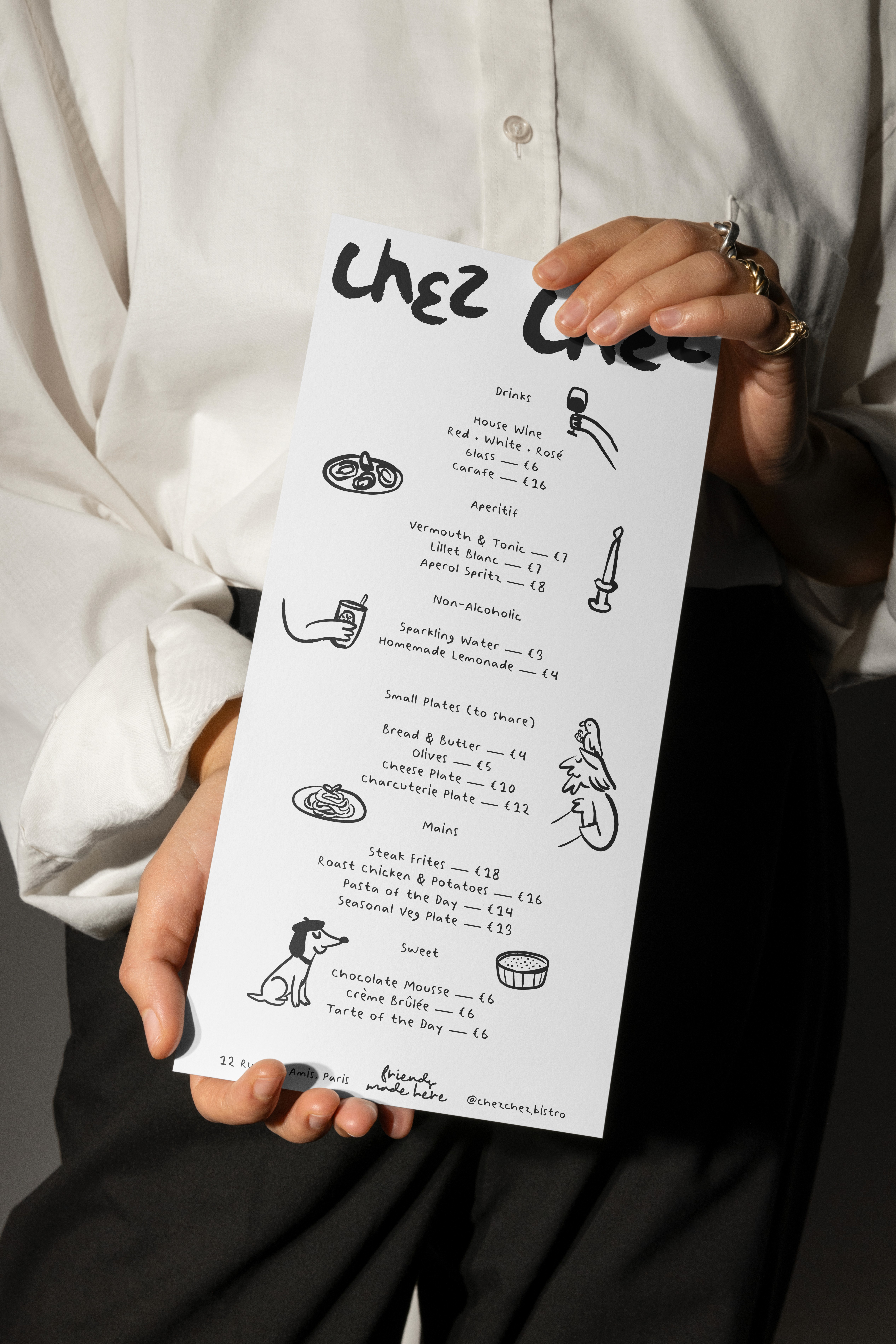Chez chez is a neighbourhood bistro where the food is unfussy, the wine flows freely, and the dog might just be wearing a beret. Warm, playful and just the right amount of chaotic — a local spot that feels like a second living room, only with better wine. The energy lives somewhere between a Parisian sidewalk and a doodle drawn on a napkin.